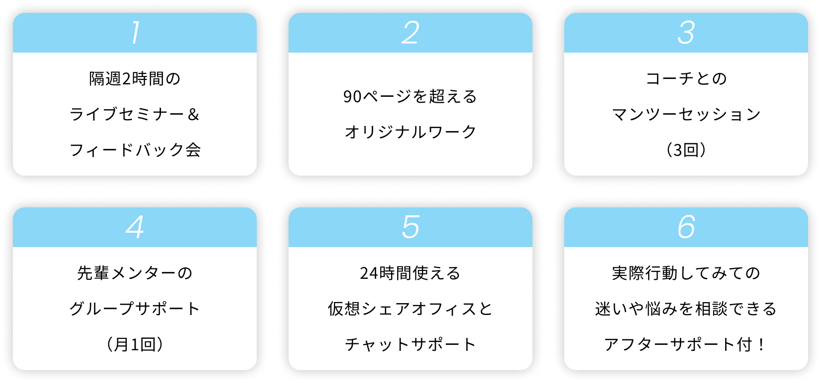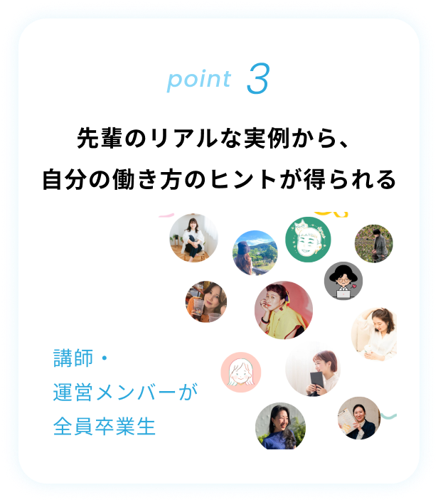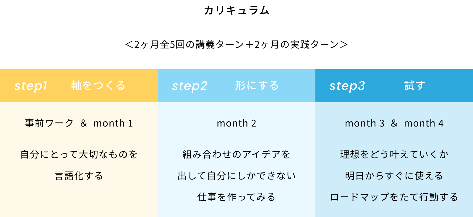 隔週のライブ講義のほか、もくもく会・1on1セッション・ワークに取り組み、自分だけのキャリアを描く3ヶ月間。