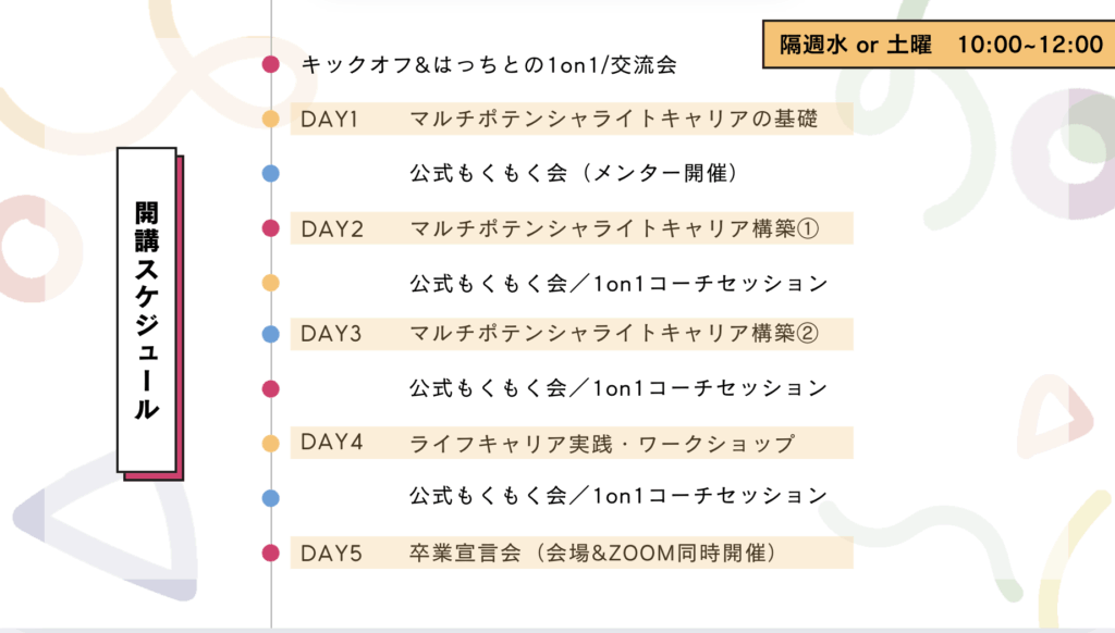 隔週のライブ講義のほか、もくもく会・1on1セッション・ワークに取り組み、自分だけのキャリアを描く3ヶ月間。